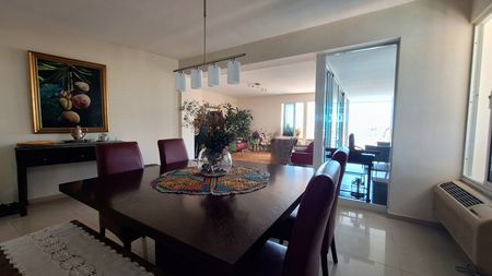 La sala consta de 2 muebles en piel, mesa de vidrio, dos butacas de mimbre, un biombo de madera, mesa comedor de 8 asientos, mesa Parson, mueble de madera con gavetas para guardar vajillas, mesa de vidrio pequeña, mata ornamental grande