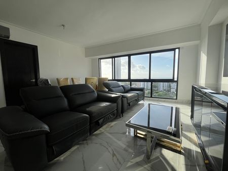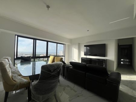 Moderno apartamento de dos habitaciones con espectacular vista al mar. Cuenta con amplios ventanales en la sala , lo que crea un espacio luminoso, cocina abierta y espaciosa, acabados elegantes, torre exclusiva con excelentes amenidades, ubicación premium, cerca de todo para una vida citadina con elegancia y seguridad. La venta del apartamento incluye los aires acondicionados, la linea blanca y los shutters.