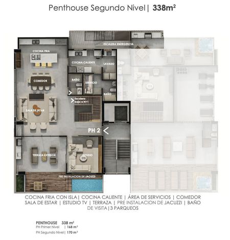 N2 PH: Sala, Comedor, Estudio, 1/2 baño, Terraza Cubierta y Descubierta (con pre instalación para Jacuzzi y bbq), Cocina Fria con isleta/desayunador, Cocina Caliente, Area de Lavado, Dormitorio de Servicio c/baño y Escalera interna.