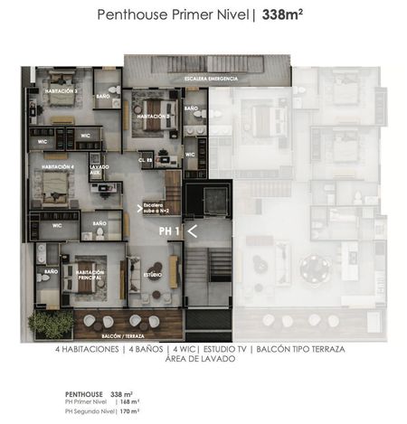N1 PH: 3 Dormitorios con W/C y baño cada uno, Dormitorio principal con W/C y baño, Estar Familiar, Area de Limpieza, Balcón tipo terraza, Escalera interna.