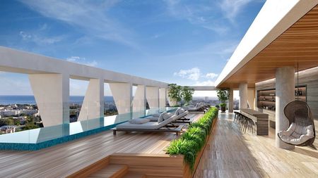 Proyecto habitacional ubicado en el corazón de Santo Domingo. Un edificio de apartamentos de 13 alturas con un diseño vanguardista, con un frontal con balcones en vidrio y estructura moderna.