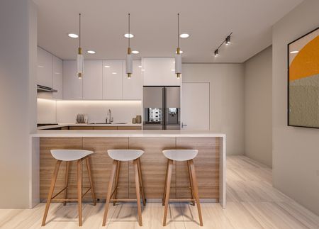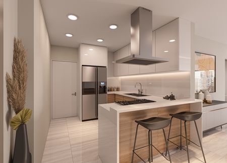 Este elegante edificio de siete niveles alberga apartamentos de dos y tres habitaciones, diseñados con una distribución óptima y acabados de primera calidad.